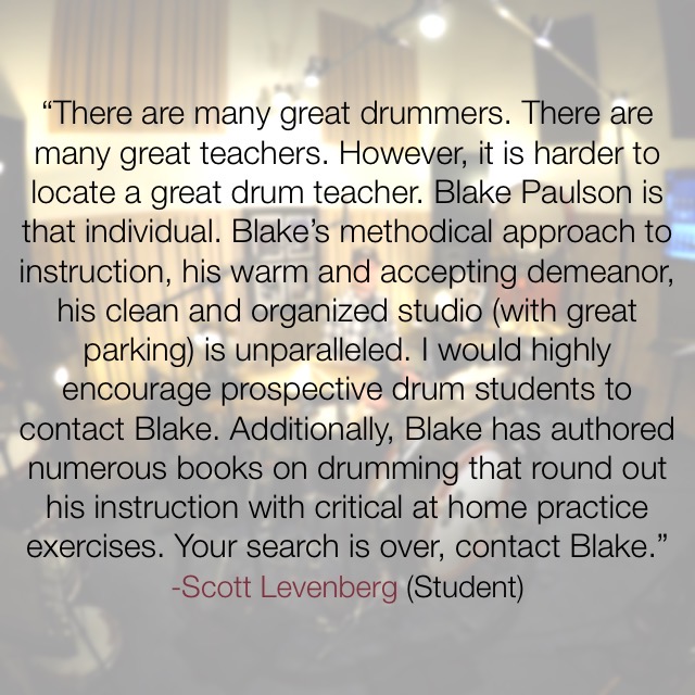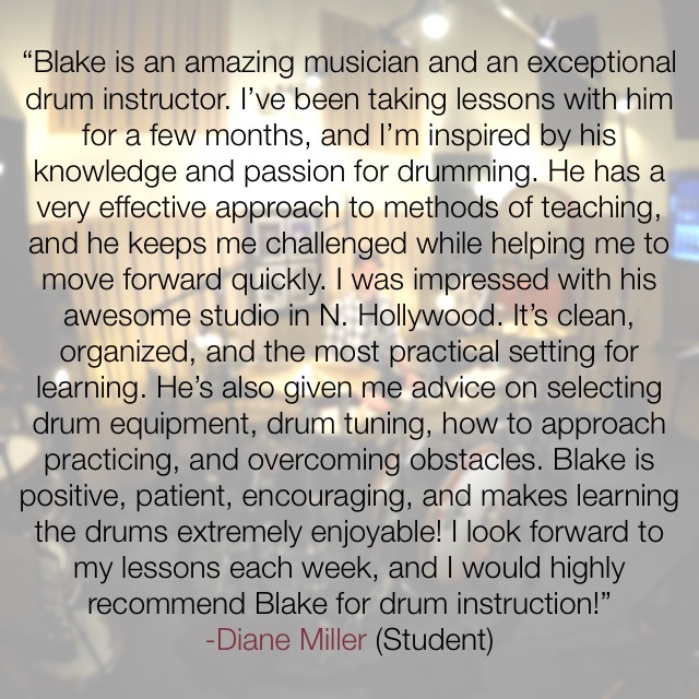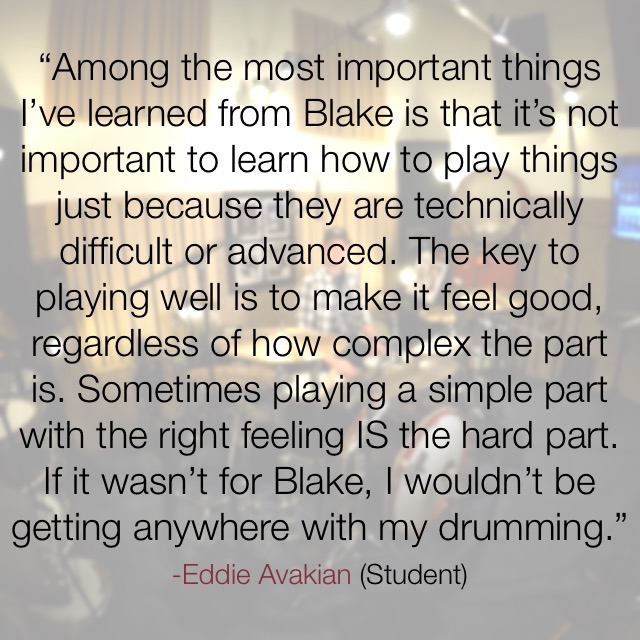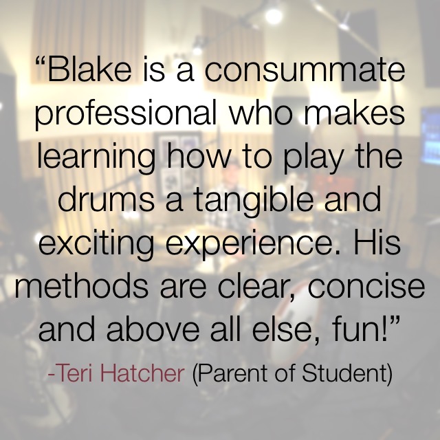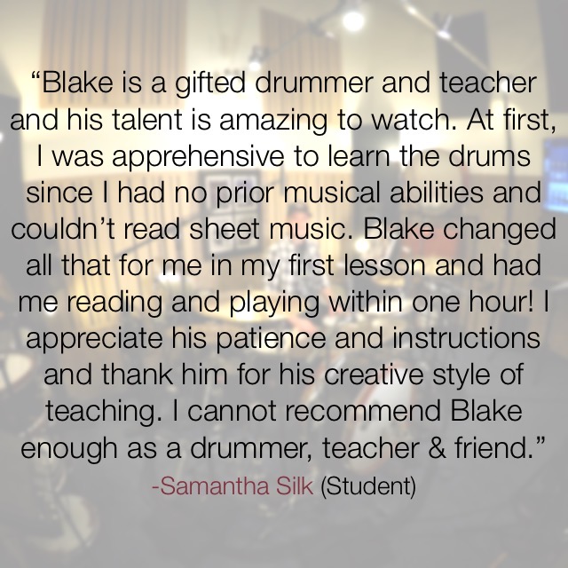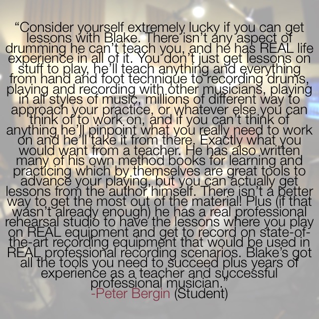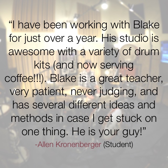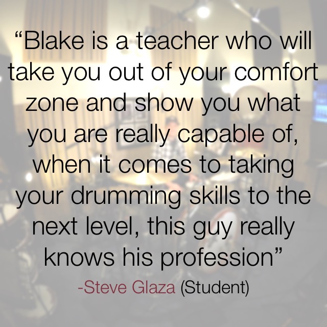 Blake is the utmost professional. He knows what he wants and knows how to get it. He’s always well prepared, very dedicated, and one of the most technically proficient drummers I’ve met.” – Darren Frank (The Village Studios)