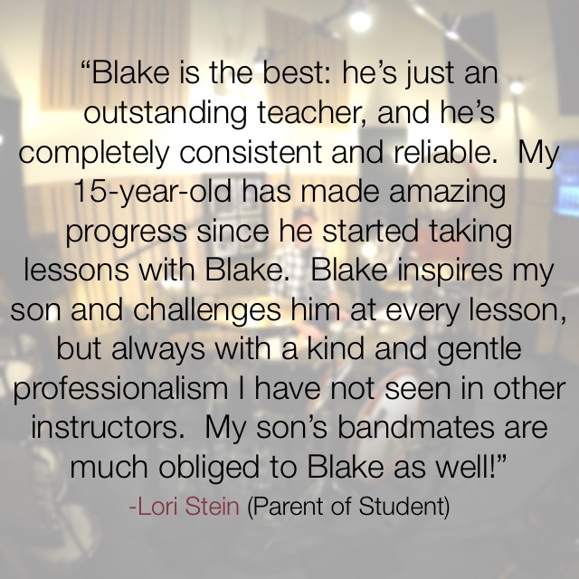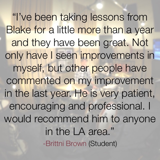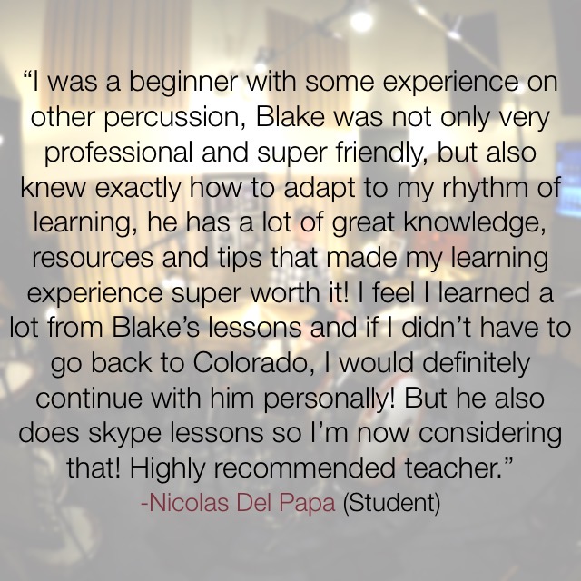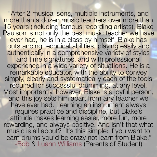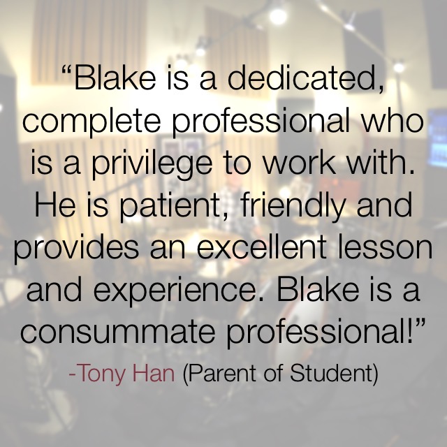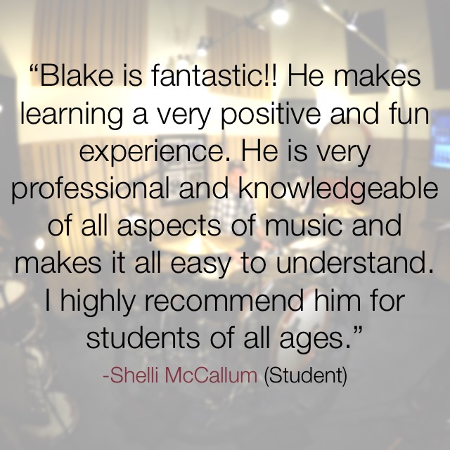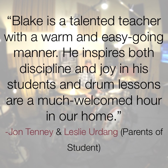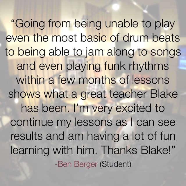 Blake is the utmost professional. He knows what he wants and knows how to get it. He’s always well prepared, very dedicated, and one of the most technically proficient drummers I’ve met.” – Darren Frank (The Village Studios)